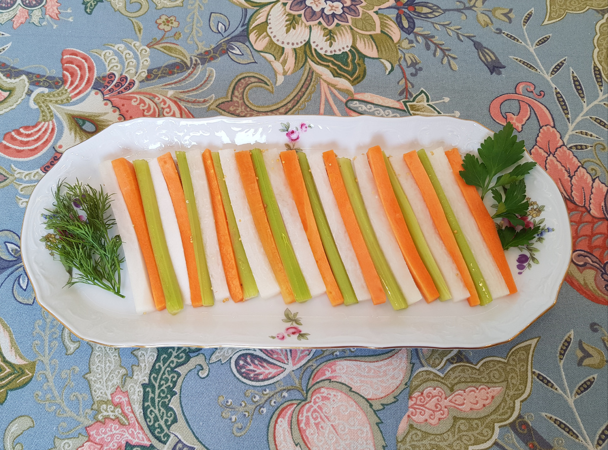 Тем временем займитесь подготовкой овощей. Нарежьте морковь и редьку длинными брусками, а стебли сельдерея разделите пополам вдоль и затем на трети. Поместите нарезанные овощи в банку подходящего размера.