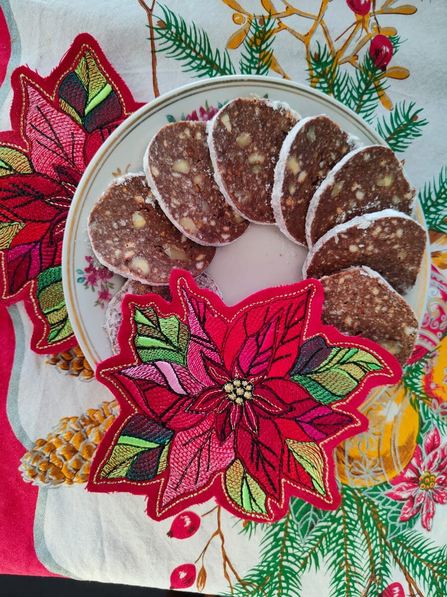 Готовую шоколадную колбаску можно нарезать как удобно, создавая красивые кружки или срезы под углом.