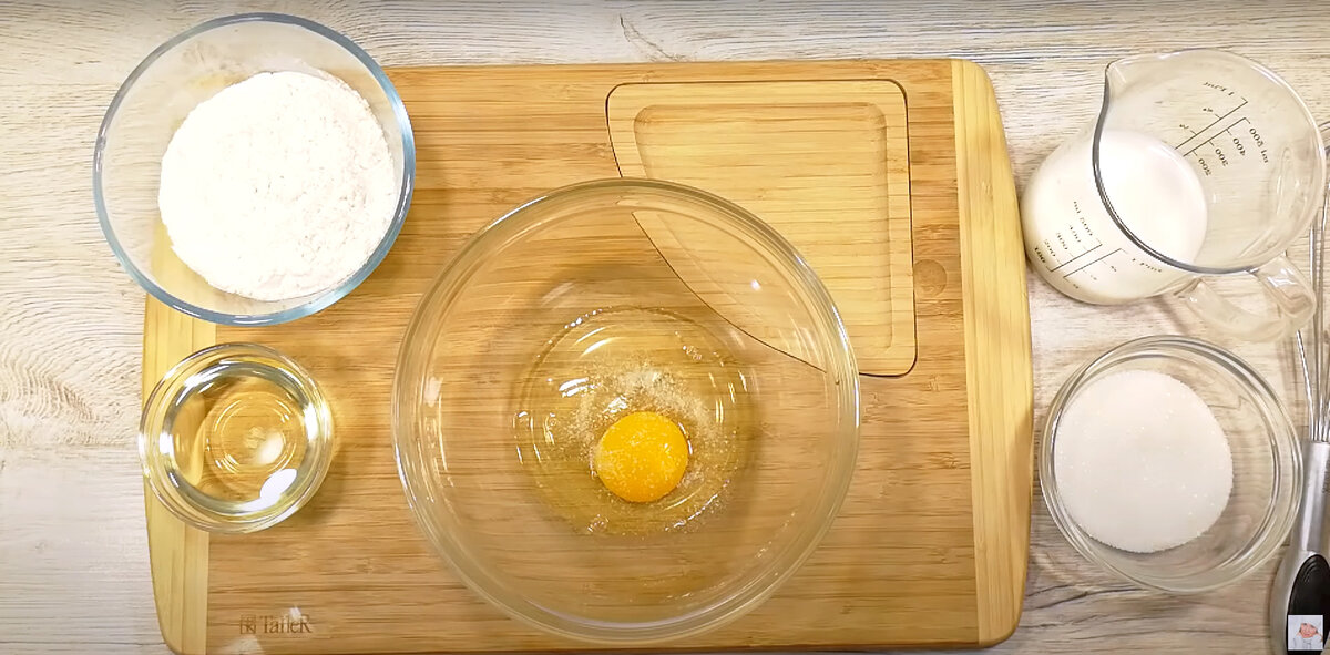 Для теста требуется всего одно яйцо, к которому добавляется щепотка соли. Сахар — около 80 граммов, который тщательно перемешивается венчиком. Затем следует добавить чайную ложку ванильного сахара и влить 150 мл молока вместе с 60 граммами растительного масла. Если растительное масло заменить на сливочное, его следует предварительно растопить в микроволновке.
