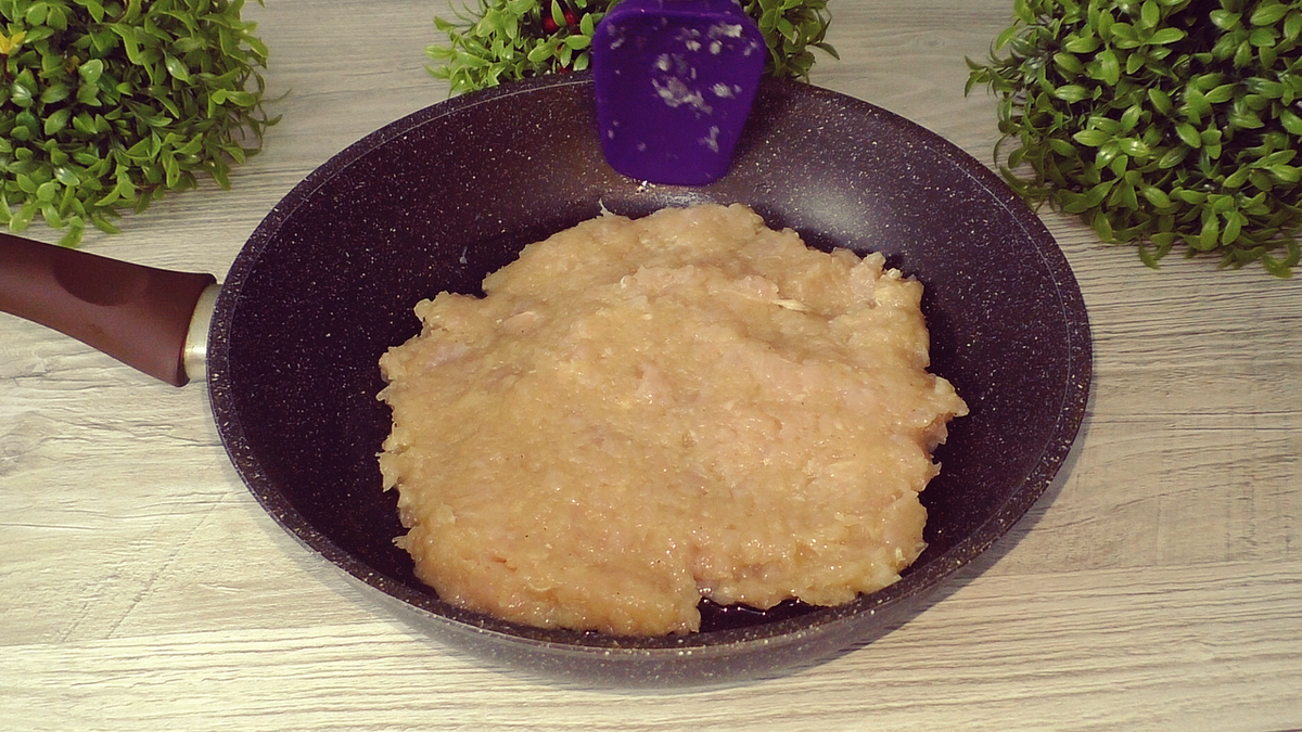 Сковороду диаметром 26 см смазывают растительным маслом, после чего равномерно выкладывают куриную массу, формируя корж. Накрыв крышкой, на максимальном огне готовят одну минуту, после чего огонь уменьшают до среднего и продолжают готовить 12-15 минут с одной стороны.