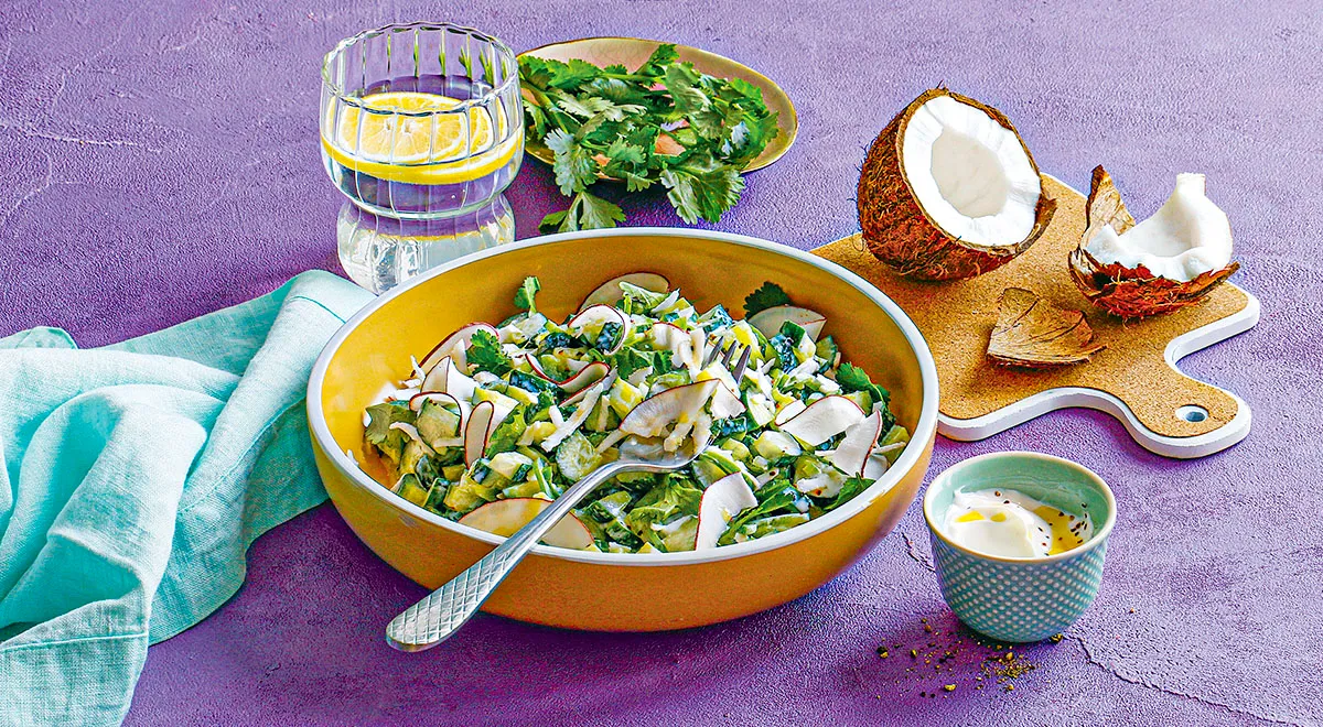 Польза огуречной райты с кокосом заключается в сочетании полезных свойств основных ингредиентов: