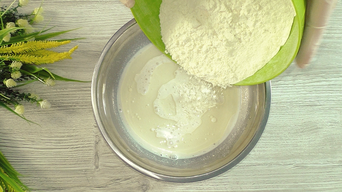 2. Далее добавить соль и растительное масло, после чего постепенно ввести муку. Тесто должно получиться слегка липким, но не слишком плотным.