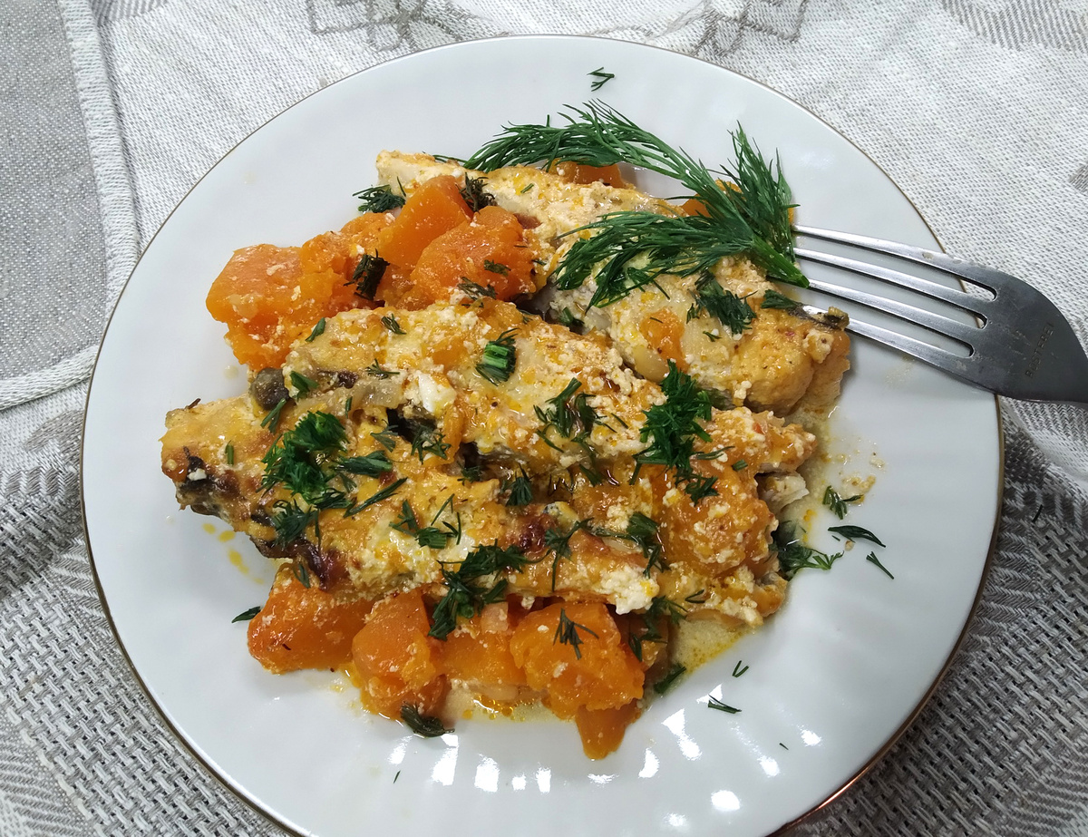 Это блюдо знакомств с невероятным сочетанием: рыба и тыква! Оказывается, их сочетание способно подарить настоящие вкусовые наслаждения, и это открытие приятно удивляет.