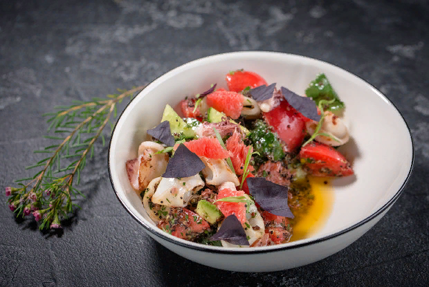 9. Кальмары посолить, смазать растительным маслом и обжарить по 2 минуты с каждой стороны на сковороде или гриле. Добавить к салату.