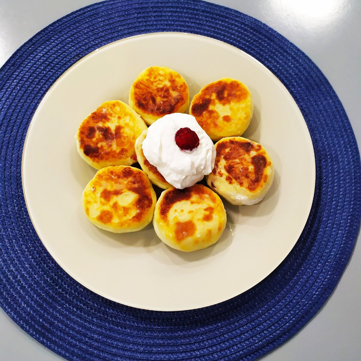 Обваляйте сырники в муке и обжарьте их на растительном масле с обеих сторон до золотистого цвета. Идеальное сочетание — сырники с малиной и черникой, но смело экспериментируйте с любыми ягодами, которые вам нравятся.