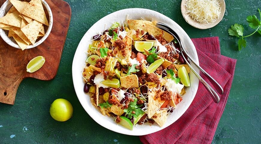 При наличии свежих грунтовых помидоров стоит использовать именно их, а в отсутствие отлично подойдут цветные черри. Молодые огурцы не требуют очистки, в то время как зимние лучше освободить от шкурки. Для приготовления мясного рагу подойдет как свежий говяжий фарш, так и остатки готового мяса. Данный салат является прекрасно сбалансированным по содержанию жиров (мясо, фасоль, сметана), углеводов (тортилья) и клетчатки (салат, овощи). Сметана смягчает остроту мяса, а свежие овощи и хрустящий латук уравновешивают блюда, придавая легкость. Чипсы добавляются перед подачей, чтобы сохранить свою хрустящую текстуру.