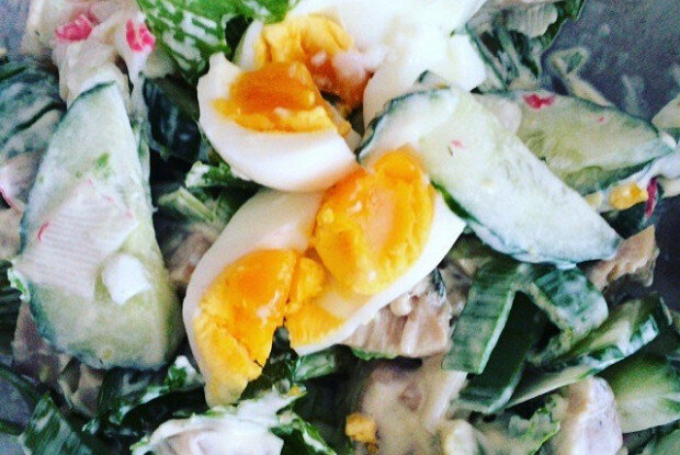 Отварите яйца. Лучше взять два и нарезать их на крупные дольки.Кальмары и крабы (можно использовать как консервированные, так и замороженные) нарежьте вдоль волокон на длинные ломтики. Замороженные лучше предварительно отварить в слегка подсоленной воде.Огурец, свежий и хрустящий, разрежьте пополам, а затем нарежьте толстыми дольками.Авокадо надо очистить, сбрызнуть лимонным соком и нарезать так же, как и огурец. Добавьте его в общий салат.Все ингредиенты аккуратно перемешайте и заправьте их майонезом. Подавать лучше порционно, например, в стильных прозрачных вазочках, чтобы салат выглядел еще более аппетитно.Этот салат станет отличным дополнением к любому застолью и порадует даже самых взыскательных гурманов. Приятного аппетита!