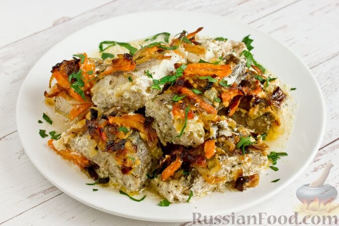 Минтай, запечённый с овощами. Эта освежающая и легкая рыбная закуска, запеченная в сметанно-горчичном соусе, очень проста в приготовлении и изумительно сочетается с любимыми гарнирами.