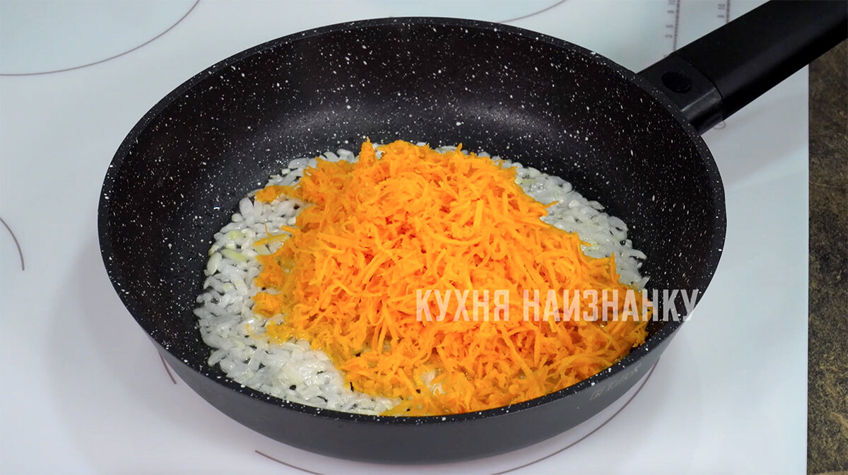 Затем в сковороду добавляют натертую на мелкой терке морковь. Этот метод помогает быстрее довести морковь до готовности и привносит интересный вкус в конечный результат.