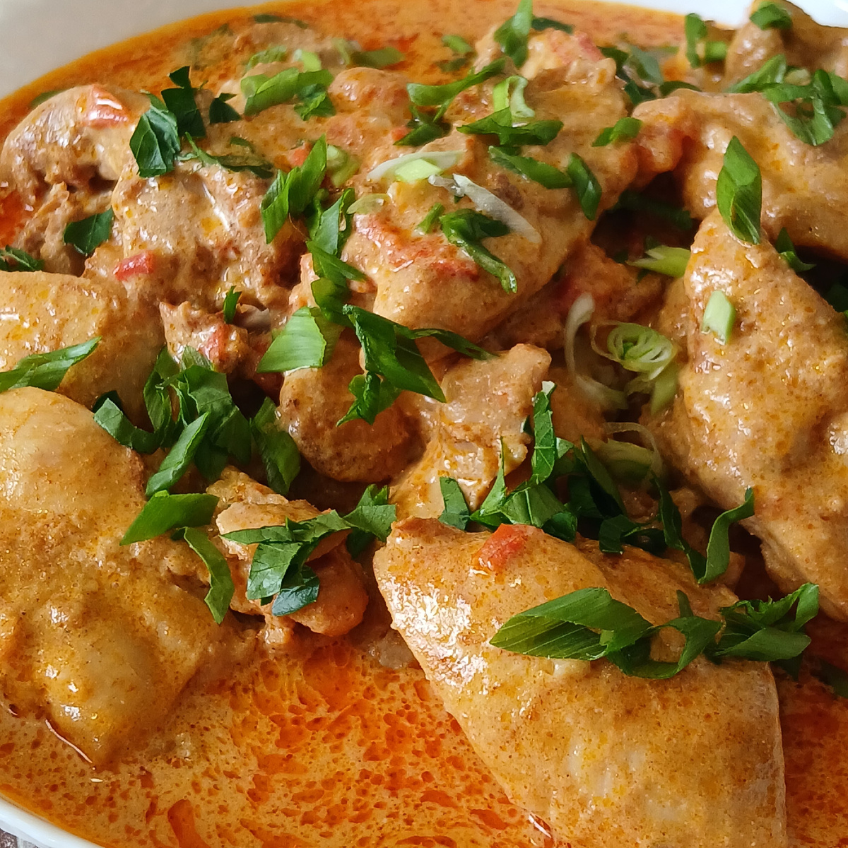 Курица в восхитительном соусе подается на тарелке и украшается свежей кинзой. Блюдо отлично сочетается с хрустящим хлебом или рисом, создавая гармонию вкусов, которая обязательно впечатлит домашних и гостей.