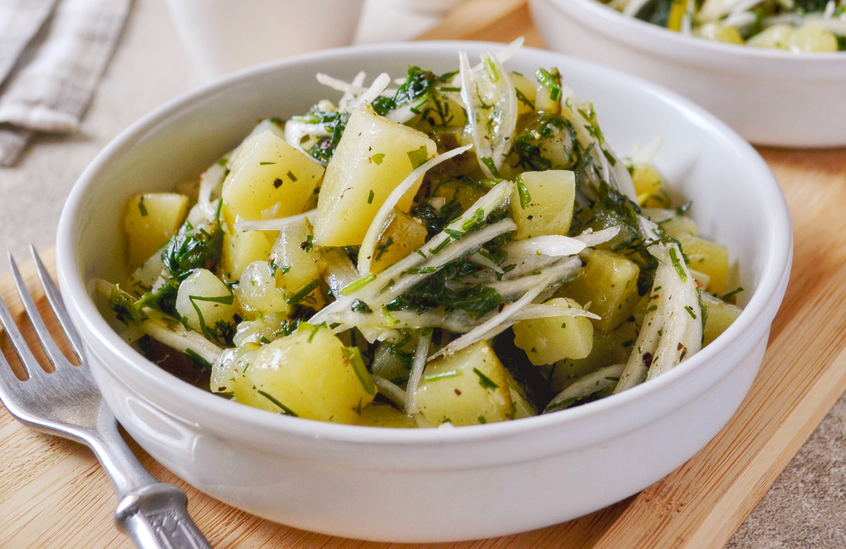 Основные этапы его приготовления невероятно просты. В начале нужно отварить картошку в мундире, затем нарезать огурец и замариновать лук. Этот салат легко готовится «на глаз» и радует насыщенным, но при этом сдержанным вкусом. Если в наличии есть свежая зелень, ее стоит добавить, но и без нее выйдет неплохо.