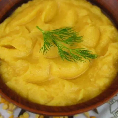 Когда картошка готова, её следует вынуть, размять в пюре и вернуть в кастрюлю с горохом. Далее добавьте упомянутые ранее обжаренные овощи. Всё тщательно перемешать. При необходимости добавьте воды до нужной густоты, посолите и добавьте специи по вкусу.