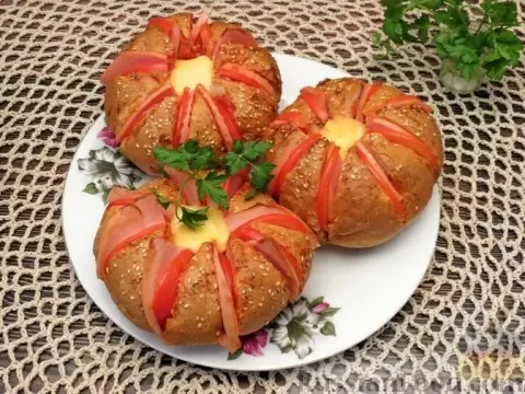 - Булочки "Цветочки". Нежные и хрустящие булочки с начинкой из колбасы, помидоров и сыра, запеченные до золотистой корочки. Это не только вкусно, но и очень красиво!