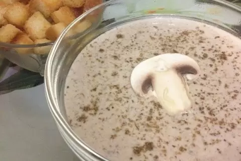 Подготовка грибов: Шампиньоны тщательно промывают под водой. Два крепких гриба откладываются. Ножки грибов нарезаются крупно, а шляпки – тонкими ломтиками. Ножки помещаются в кастрюлю с 1-1,5 литра холодной воды, добавляют тимьян и неочищенный зубчик чеснока. Кастрюлю доводят до кипения и варят на медленном огне под крышкой в течение 30 минут.Обжарка шляпок: В большой сковороде разогревается часть оливкового масла. В нее добавляют нарезанные шляпки, солят и накрывают крышкой. На сильном огне грибы готовятся 5 минут. После чего в сковороде должен появиться грибной сок, который аккуратно выливают в кастрюлю к ножкам. Добавляется оставшееся оливковое масло, перемешивается, и обжаривается еще 10 минут.Финальные шаги: За 5-10 минут до завершения варки в кастрюлю с ножками добавляют шляпки (тимьян и чеснок следует удалить). Отливают стакан бульона и слегка охлаждают. В сотейнике растапливают сливочное масло, добавляют муку и обжаривают 3-4 минуты, постоянно помешивая. Затем тонкой струйкой вливают отложенный бульон, тщательно размешивают, готовя еще 7-10 минут.Суп переливают в блендер, добавляют заправку из сотейника и взбивают до однородности. Возвращают массу в кастрюлю, доводят до кипения, вливают сливки, нагревают, не доводя до кипения, и приправляют по вкусу.Для подачи заранее отложенные шампиньоны нарезают, а сушеные белые грибы с тимьяном перетирают в порошок. Суп разливают по предварительно подогретым тарелкам, в центр кладут ломтики шампиньонов и посыпают грибным порошком с тимьяном. Подается немедленно.Кулинарный шедевр готов! Приятного аппетита!