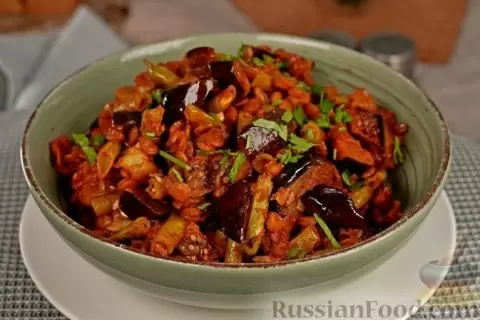 - Чечевица с баклажанами и стручковой фасолью. Это блюдо готовится на сковороде, а томатный соус соединяет ингредиенты в гармоничном сочетании. Паприка и зира делают его ароматным и питательным.