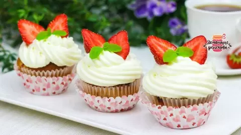 Для приготовления крема взбейте холодный сливочный сыр, жирные сливки, сахарную пудру и ванильный сахар до получения крепких пиков. Поместите готовый крем в кондитерский мешок и украсьте им остывшие маффины. Сверху разрежьте клубнику пополам для декора.