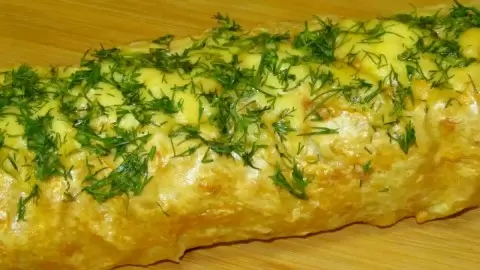 3. Чтобы рулет хорошо подрумянился, его необходимо смазать взбитым яйцом. Для золотистой корочки можно добавить ложку молока. Подготовленный рулет помещается в разогретую до 180 градусов духовку на 30 минут. После этого сверху дополнительно выкладывается сыр и еще 5 минут запекается до образования аппетитной корочки.