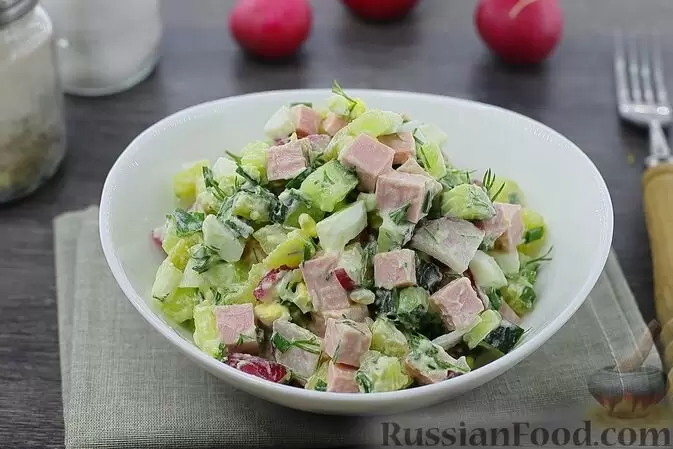 - Овощной салат с колбасой и яйцами — это яркое сочетание свежих овощей, хрустящих огурцов и нежных яиц. Добавление ароматной сметанно-горчичной заправки придаёт этому блюду уникальные нотки.