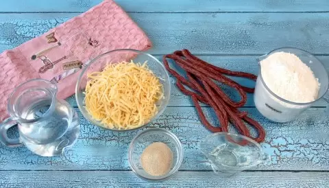 Когда тесто подойдет, его следует аккуратно растянуть на рабочей поверхности. При этом не потребуется посыпать мукой, если тесто вымесили должным образом — оно не будет прилипать к рукам. Затем на раскатанное тесто выкладывается нарезанная колбаса и посыпается тертым сыром. Края теста загибаются к центру, после чего сформированное изделие перекладывается швом вниз на противень, застеленный пергаментом.