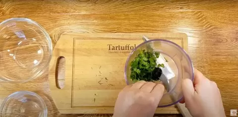 К зелени добавляют несколько зубчиков чеснока и горсть грецких орехов, которые придадут начинке интересную текстуру и вкус. Все ингредиенты следует хорошо измельчить до однородной массы.