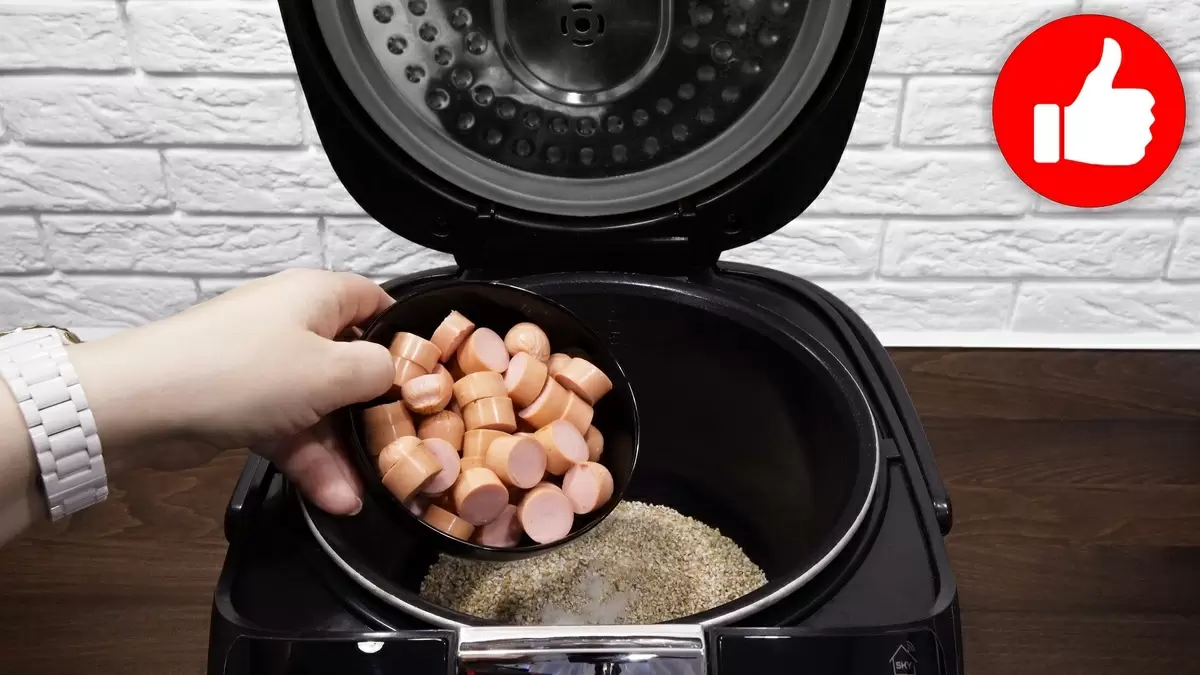 Выбор режима «Рис/Крупы» позволит добиться идеальной консистенции. Время приготовления — около 35 минут. По истечении времени каша получится не только сытной, но и очень ароматной, ведь сосиски добавят ей неповторимый вкус.