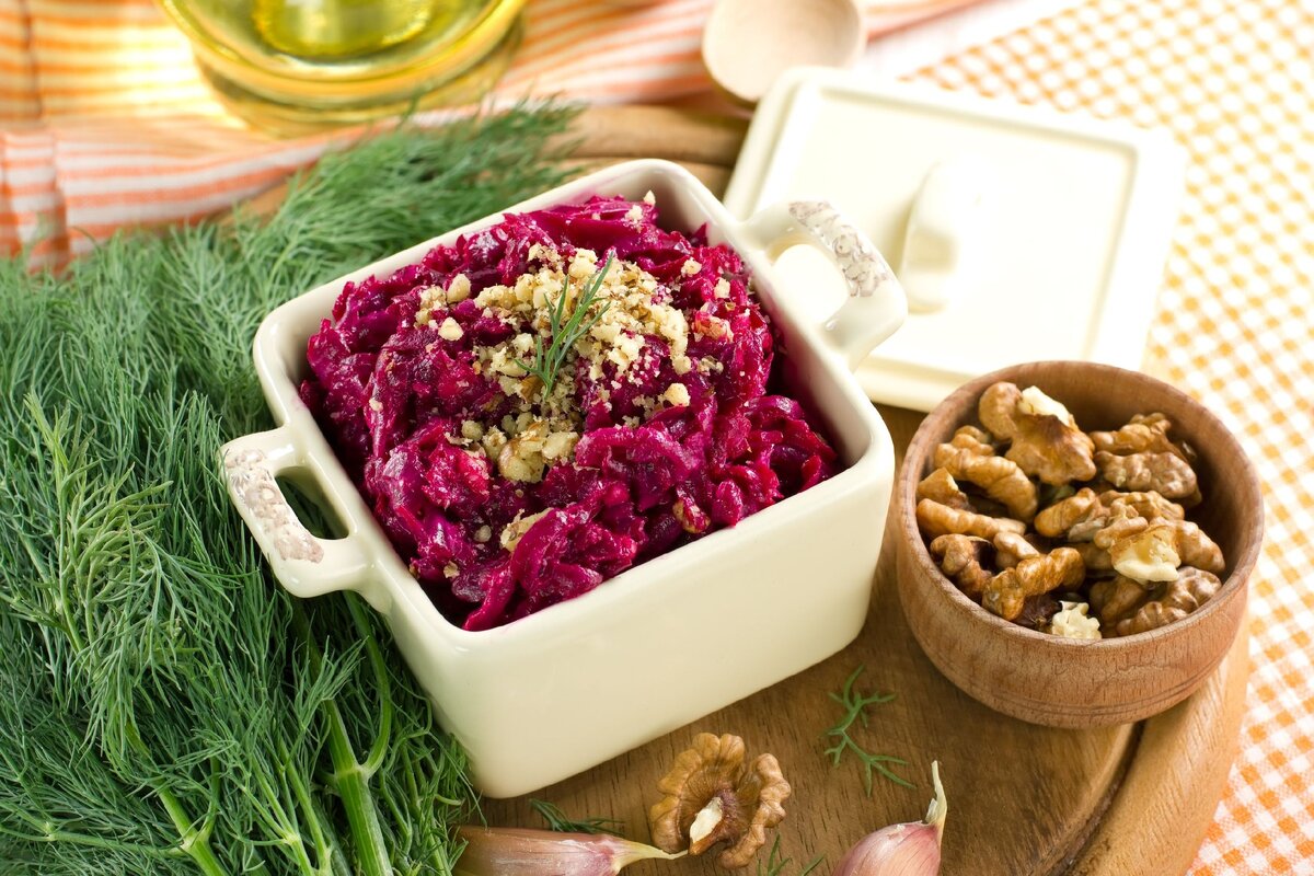 - Отварить свеклу, остудить, очистить и натереть. Смешать со свеклой, орехами и черносливом, заправить оставшимся майонезом.