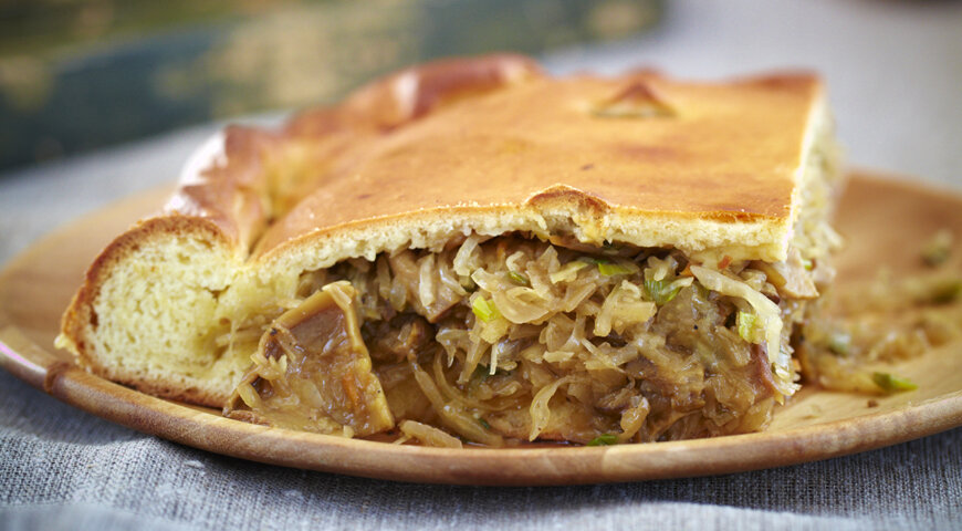 Замочите грибы в 500 мл теплой воды на 1 час. После этого доведите до кипения и варите до мягкости (примерно 10-15 минут). Процедите отвар через полотенце и потом уварите до 100 мл.Промойте квашеную капусту, тщательно отожмите и мелко порежьте. Также нарежьте зеленый лук.На сковороде обжарьте нарезанный репчатый лук в растительном масле до золотистого цвета (около 10 минут). Затем добавьте нарезанные грибы и жарьте еще 3 минуты. После этого добавьте капусту и грибной отвар, потушите массу несколько минут.Отдельно обжарьте зеленый лук на растительном масле и добавьте в начинку.Разделите тесто на две части: 2/3 и 1/3. Раскатайте большую часть в пласт, чтобы он слегка свисал с краев противня. Выложите начинку и полейте грибным отваром, сбрызните ароматным маслом.Раскатайте оставшуюся часть теста и положите его сверху начинке. Поднимите края нижней части и соедините с верхним слоем, защипнув края. На поверхности сделайте 6 отверстий для выхода пара и смажьте тесто крепким чаем.Выпекайте пирог в разогретой до 180°С духовке на протяжении 40 минут.По готовности, смажьте пирог ароматным маслом и дайте немного остыть перед подачей (около 20 минут).