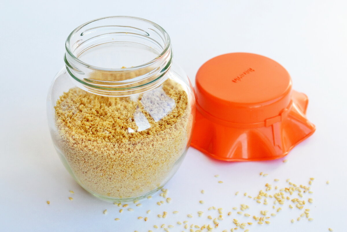 Для достижения наилучшего результата смесь кунжута и соли можно растолочь в ступке. Однако многие предпочитают быстрое решение — поместить весь состав в кофемолку или блендер. Измельчать массу следует порциями по 30 секунд, чтобы добиться нужной текстуры. После этого все ингредиенты объединяются в одну ёмкость.
