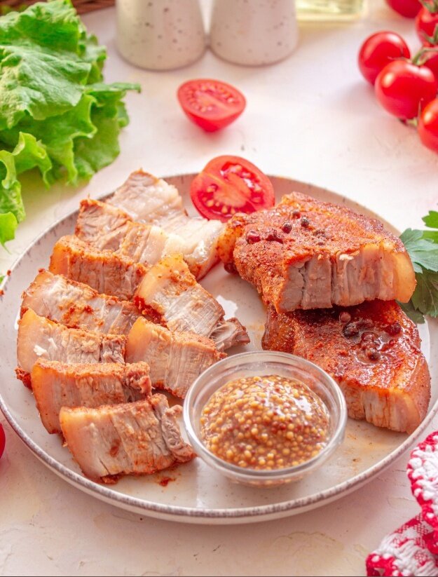 После этого тщательно промойте свиную грудинку, затем обсушите её. Не забудьте натирание со всех сторон — это ключ к насыщенному вкусу.