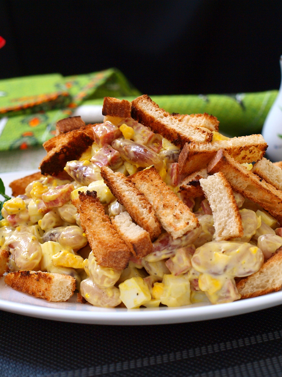 Салат с фасолью, сухариками и колбасой
