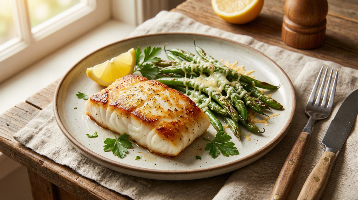 Золотистая рыба с хрустящей корочкой и ароматная фасоль, запеченная с пармезаном, создают атмосферу настоящего ресторанного ужина, при этом готовится всё невероятно просто. И главное — всего 8 граммов углеводов на порцию!