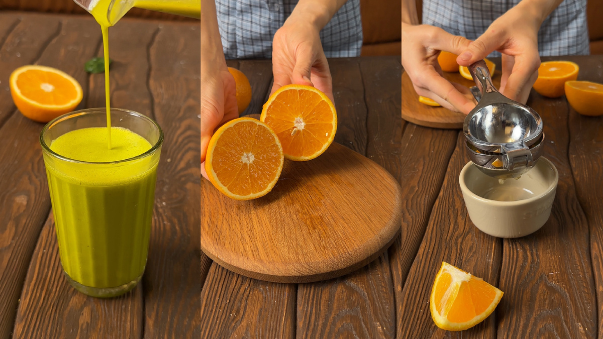 - Выжимаем сок апельсина. Он добавит яркость и витамин С, прекрасно дополняя вкус тыквы.
