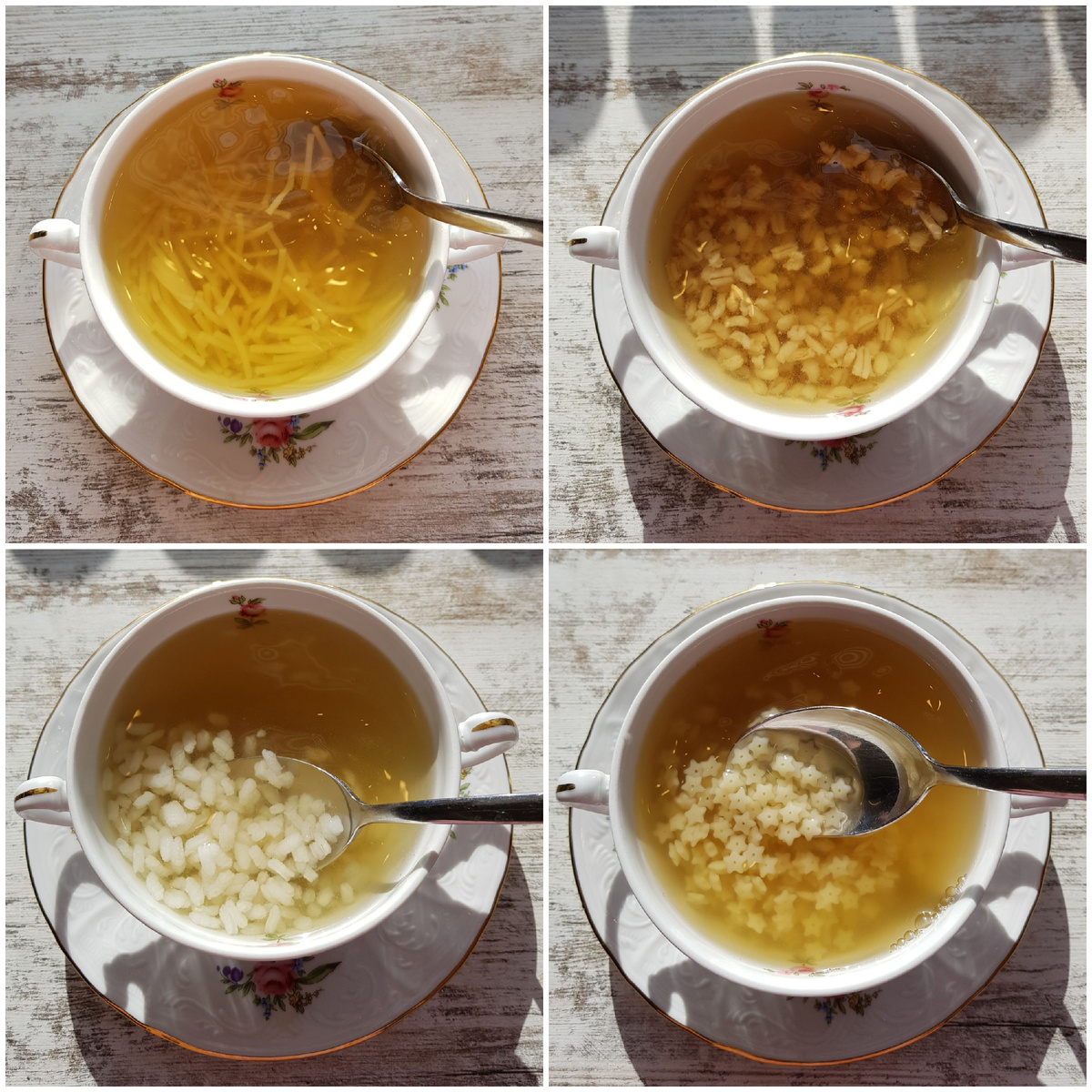 - Приготовление: вкипятить стакан воды, бросить вермишель на одну минуту, затем откинуть на дуршлаг и добавить в консоме, варя еще 7 минут.