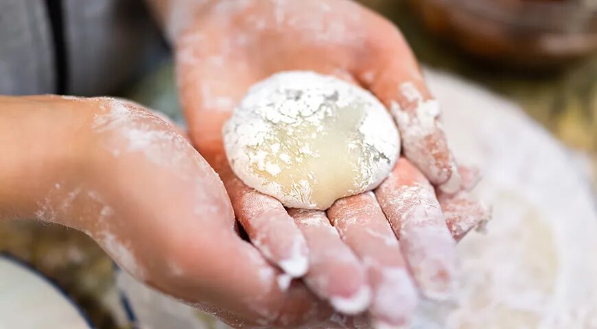- Соберите края лепешки, защипните и аккуратно скатайте в шарик.