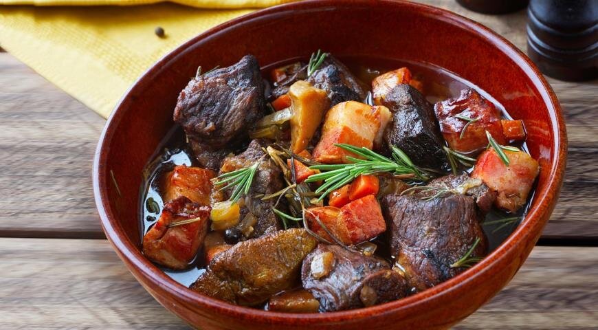 3. Тушение: Достать мясо и овощи, обсушить. Процеженный маринад довести до кипения в сотейнике, затем уменьшить огонь и уваривать 10 минут. В сковороде обжарить нарезанную грудинку и затем обжарить мясо с обеих сторон до золотистой корочки. Влить винный соус и тушить 1 час. Далее добавить овощи и готовить еще 40-50 минут, пока мясо не станет мягким и не будет разделяться на волокна. После завершения готовки добавить обжаренные грибы и настоять 10-15 минут перед подачей.