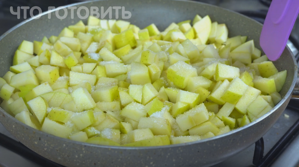 Начать стоит с размягчения яблок на сковороде: необходимо добавить немного сахара и корицу, чтобы они стали мягкими и ароматными.