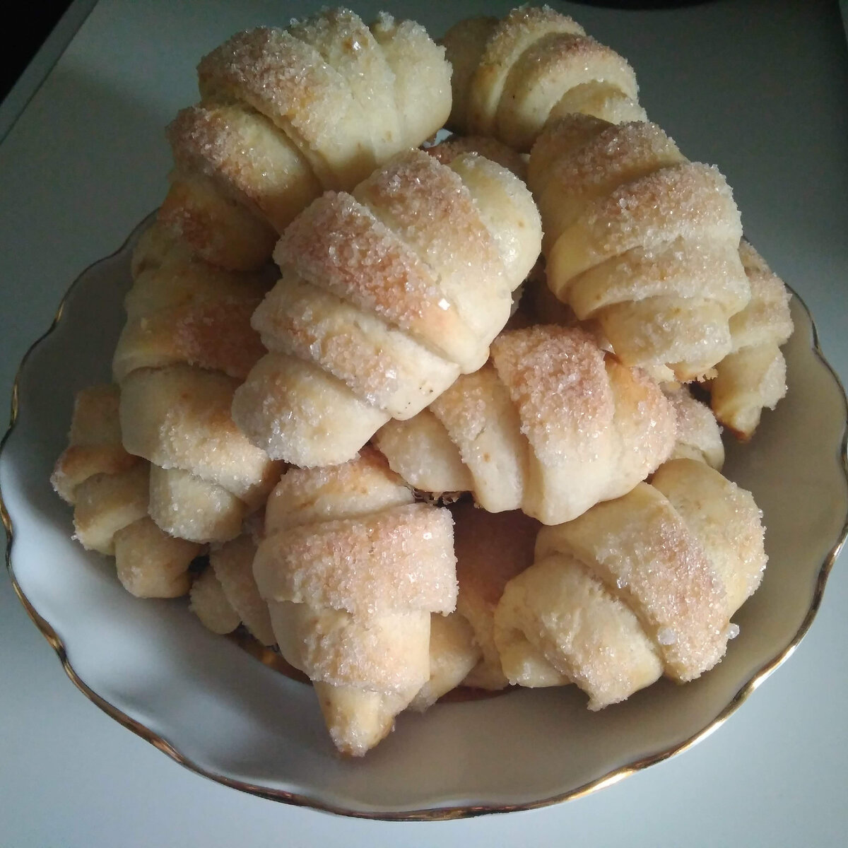 Завернуть треугольники, начиная с широкого края, и обмакнуть верхнюю сторону в сахар. Выложить рогалики на противень на небольшом расстоянии друг от друга — по 16 штук на противень.