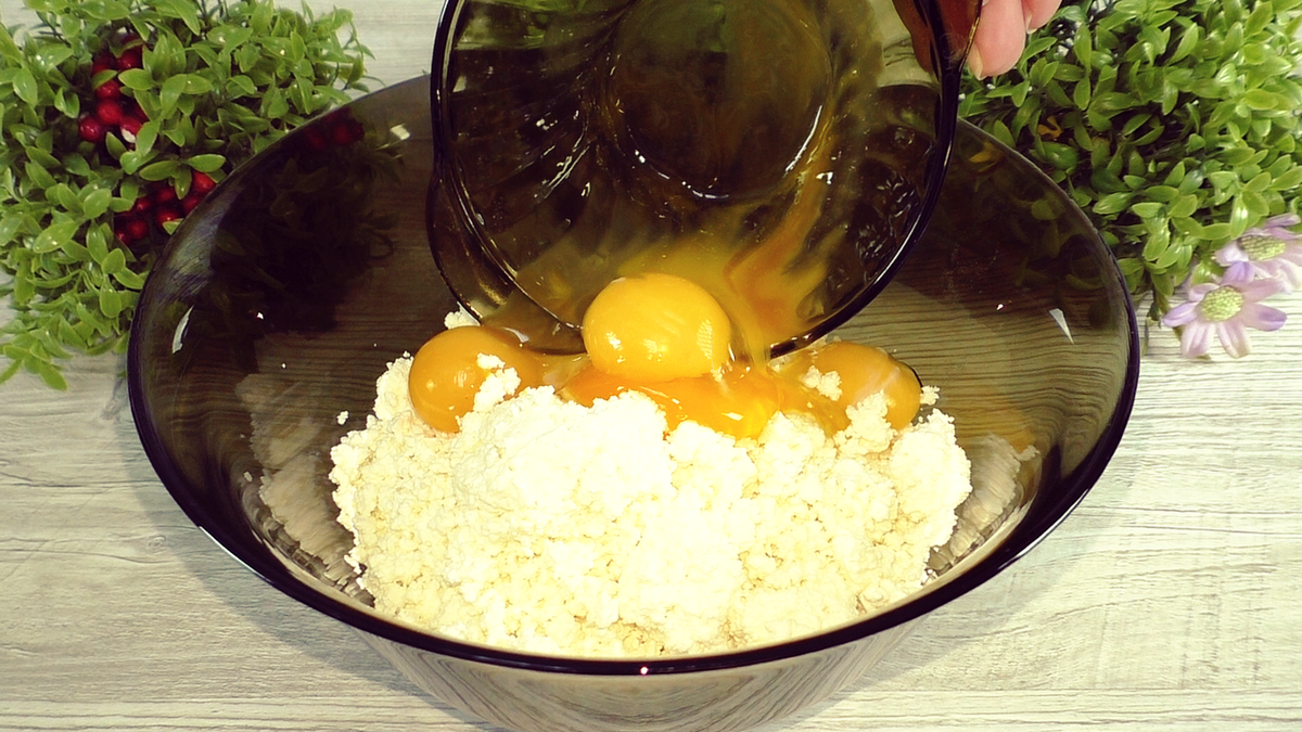 В глубокой миске объединить творог и желтки, белки пока оставить в стороне.