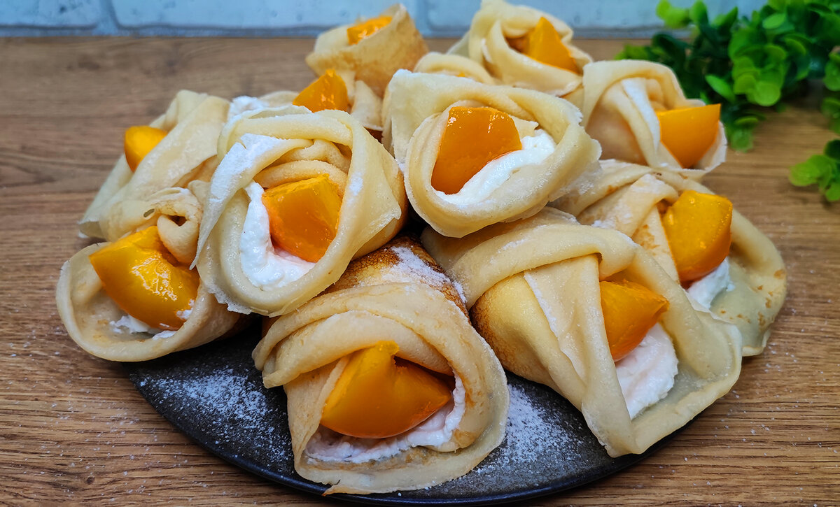 Основная изюминка этого рецепта заключается в начинке — она удивительно вкусная и сочетает в себе творог и консервированные персики, что делает блинчики невероятно сладкими и нежными. Пора приступать к приготовлению!