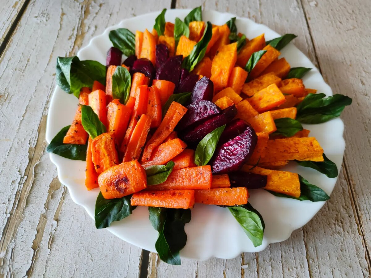 Теперь нарежьте овощи палочками. Каждый вид отдельно сбрызните оливковым маслом, добавьте соль и ваши любимые специи:
