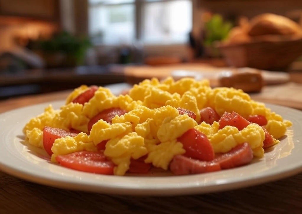 - Приготовление: Для начала нарежьте 100 г вареной колбасы (например, докторскую) кубиками. Разогрейте 1 столовую ложку масла на сковороде и обжарьте колбасу около 3 минут, пока она не подрумянится. Затем разбейте 3 яйца, стараясь не повредить желтки. Добавьте соль и перец по вкусу, жарьте на среднем огне 4–5 минут, оставляя желтки слегка жидковатыми.