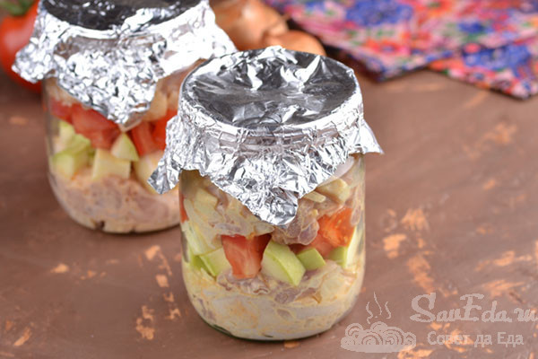 Обработать куриное мясо: отделите филе от костей, нарежьте его на кусочки и приправьте солью, молотым черным перцем и 1/2 чайной ложки сладкой паприки.Добавьте к курице мелко нарезанный лук, майонез и чеснок, предварительно пропущенный через пресс, тщательно перемешайте. Если хотите, майонез можно заменить сметаной.Нарежьте помидор и кабачок кубиками.Приготовление требует использования банок объемом 500 мл. Убедитесь, что на банках нет сколов. Этот способ идеален, если у вас нет глиняных горшков. На дно каждого стеклянного контейнера выложите куриное филе с луком и чесноком (по 1/4 части).Затем добавьте нарезанные овощи (по 1/2 части) и сверху остатки курицы. Не заливайте водой - сок овощей и мяса сделает блюдо влажным и вкусным. Оставьте немного свободного пространства, чтобы сок не выкипал при кипении.Накройте банки фольгой (или используйте металлические крышки без резинового кольца) и разместите их в холодной духовке. Установите температуру на 200 градусов и готовьте 40 минут.Как только время пройдет, вы получите великолепное блюдо с ароматом, который вызовет аппетит. Внутри образуется густой и вкусный соус, делающий курицу особенно нежной.Подавайте курицу с овощами с любимым гарниром и наслаждайтесь восхитительным вкусом!Приятного аппетита!