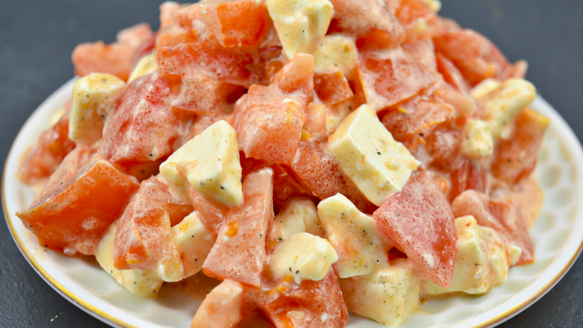 1. Начинается приготовление с нарезания помидоров на мелкие кубики. Важно выбрать плотный плод, чтобы он хорошо держал форму.