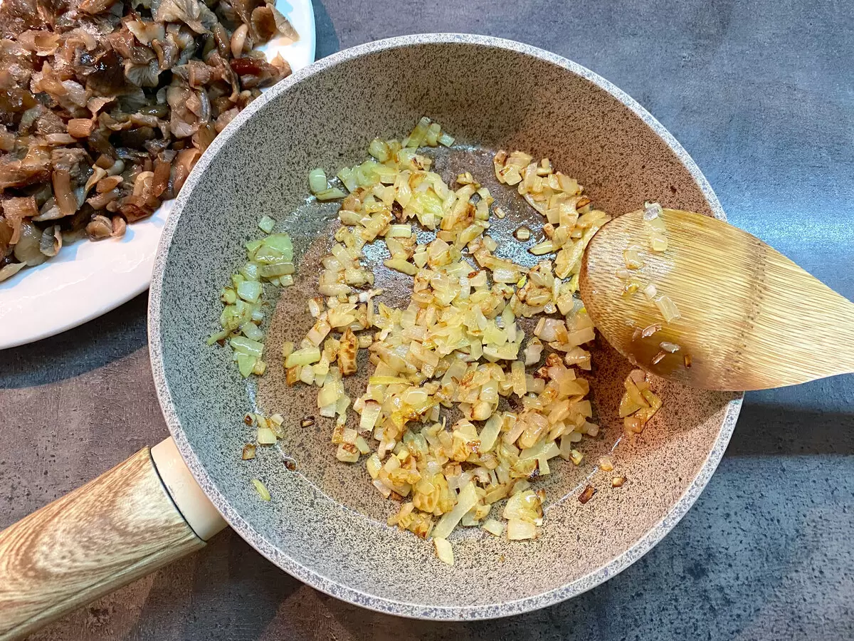 Когда лук обжарился, пришло время добавлять грибы. Их стоит также обжарить до румяной корочки и приправить солью по вкусу. Важно, чтобы вся жидкость испарилась, а грибы стали поджаристыми.