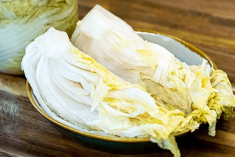 Разделите капусту на четыре части или больше, ориентируясь на ее размер.Тщательно натрите каждый листочек солью.Поместите обработанную капусту в заранее подготовленную чистую банку. Если горлышко банки слишком узкое, положите просоленные четвертинки в кастрюлю, накройте пленкой и оставьте на ночь при комнатной температуре. На утро капуста станет более мягкой и удобной для укладки в банки. Выделившийся сок также стоит перелить в банки.Убедитесь, что сока достаточно, чтобы накрыть капусту; если его недостаточно, добавьте 2-3% раствор соли.Ждите, пока капуста не готова – это займет 3-4 недели.Для ускорения процесса можно использовать немного рассола из предыдущего брожения: в этом случае квашеная капуста будет готова уже через 1-2 недели.