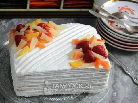 - Ингредиенты для крема: 700-800 г сметаны (от 18%), сахарная пудра (от 5 ст.л.), загуститель по желанию, растительное масло для бумаги, консервированные фрукты для украшения.