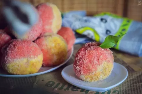 Смешать сгущенное молоко с джемом и оставшимися кусочками теста до получения однородной массы. Сформировать "персики" из двух половинок, заполнив одну начинкой с добавлением ореха. Чтобы пирожные напоминали настоящие плоды, в молоке растворить красный краситель и куркуму. Затем каждое "персик" окунуть в приготовленные красители и обвалять в сахаре. Оставить на тарелке пропитываться на несколько часов.