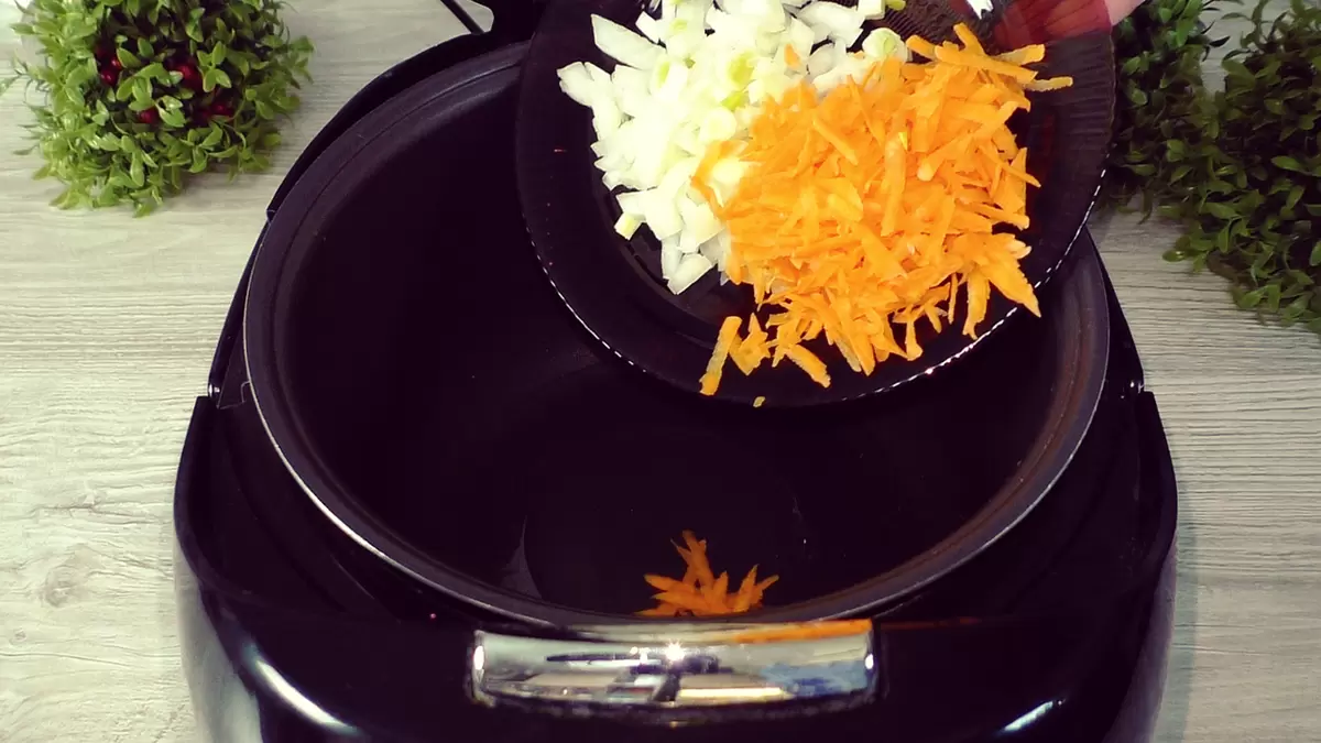 Для начала очищается и натирается на крупной терке морковь, а лук нарезается маленькими кубиками. Затем мультиварка включается на режиме «жарка», куда добавляется растительное масло для нагрева.