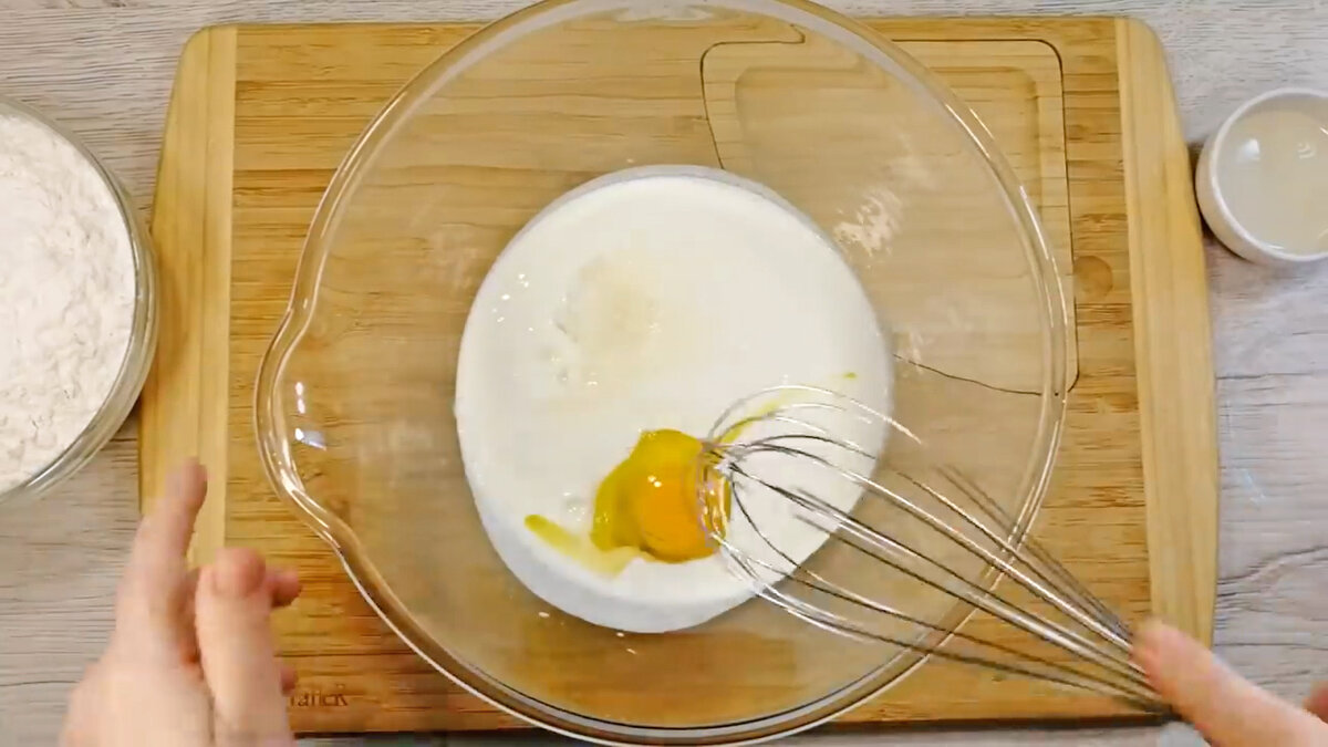 Первоначально кефир смешивают с солью и сахаром, после чего добавляют яйцо и тщательно перемешивают. В отдельной миске муку соединяют с содой, а затем объединяют обе смеси. Необходимо замесить мягкое и эластичное тесто, постепенно вводя растительное масло. Удобнее всего делать это руками. Тесто накрывают и оставляют на 15 минут для подъема.