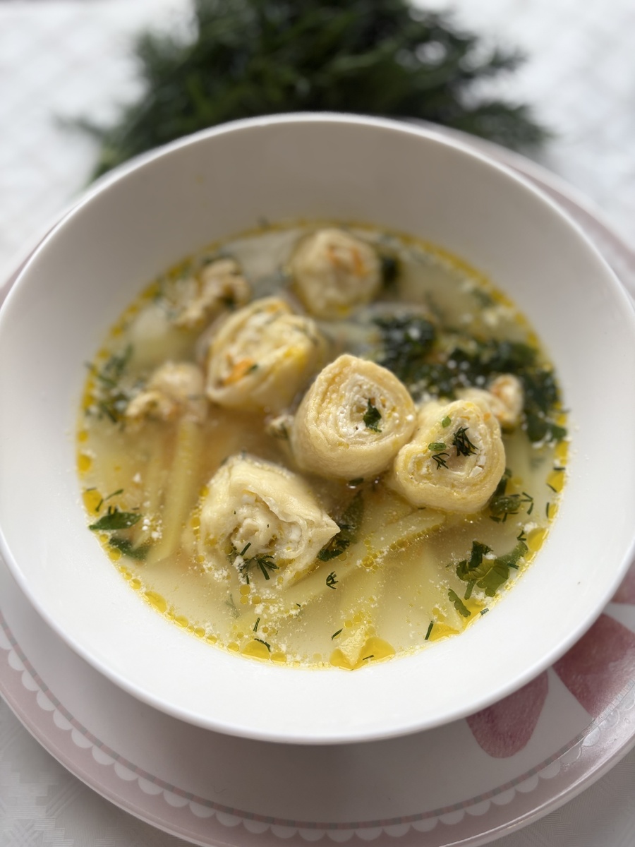 Рулеты добавляют в кипящий суп и варят еще 7 минут. В конце добавляется мелко нарезанная зелень, например, укроп или кинза, и суп настаивается еще 5 минут. Это блюдо станет отличным вариантом для обеда или ужина, притягивая всю семью к столу.